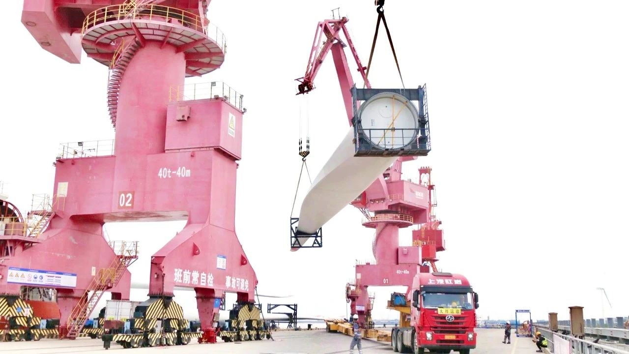 “這批風(fēng)電葉片發(fā)往上海金山,共計(jì)36套,單套長度達(dá)110米,目前已完成18套的裝載作業(yè),這是第9船次。我們班組正全力協(xié)作,力爭在6小時(shí)內(nèi)完成本船次的裝運(yùn)任務(wù),確保按時(shí)離港。”江蘇鹽城港風(fēng)電裝備進(jìn)出口港有限公司生產(chǎn)組二班班長祁正磊介紹道。