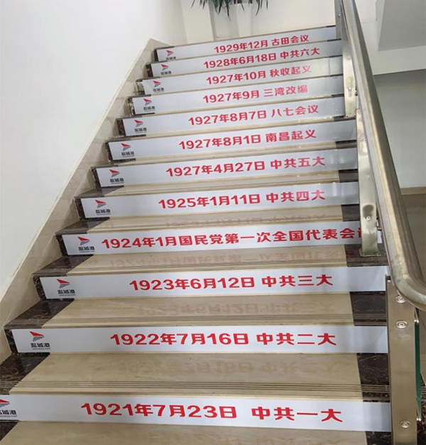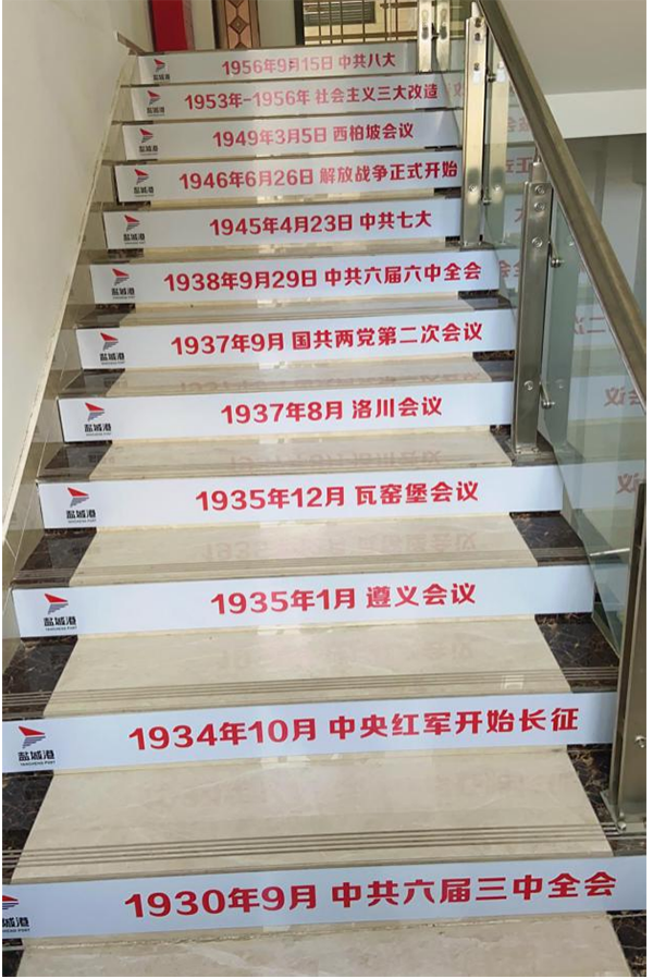針對廣大干部職工工作實際,響水港區精心設計,細心研究,將學習形式和載體不斷創新。近日,響水港區創新打造“樓梯課堂”,將黨史發展時間歷程貼印在樓梯上,方便大家在上班閑暇時,無形地將黨史知識學進腦子里。“樓梯課堂”的每一個階梯同時也代表著黨的每一個發展歷程,一步一臺階,扎扎實實譜新篇。響水港區員工普遍反映這個學習方式有創意有實效,鞏固加深了他們對黨史的掌握程度,也提高了他們學習黨史的興趣。