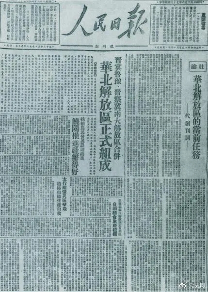 1948年6月15日,晉冀魯豫解放區(qū)《人民日?qǐng)?bào)》與《晉察冀日?qǐng)?bào)》合并后出版的《人民日?qǐng)?bào)》創(chuàng)刊號(hào)。