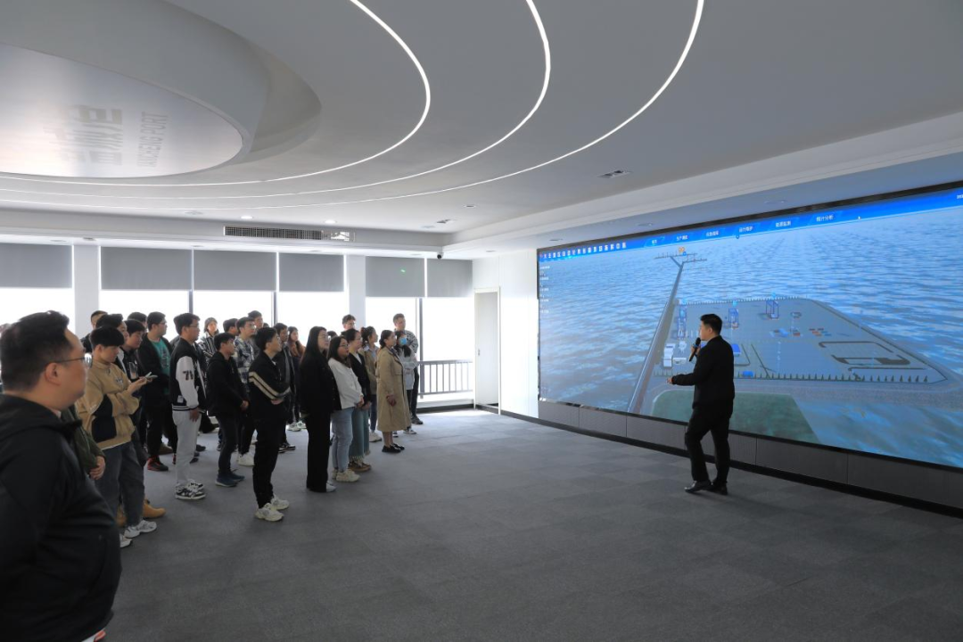 活動當天,團員們首先來到鹽城港自動化集裝箱堆場進行參觀。作為全省沿海地區首個自動化集裝箱堆場,鹽城港自動化集裝箱堆場項目具有自動化無人軌道吊、智能一體化操作系統、5G+北斗融合網絡、強弱電智能化系統等四項核心技術,綜合運用自動化控制、數字孿生等先進手段,實現整個堆場作業區域的無人化,并將作業效率提升30%以上。團員們在自動化集裝箱堆場及碼頭前沿,詳細聽取工作人員詳實而生動地現場講解,領略港口碼頭開闊磅礴的壯美風光,深刻領悟“科技興,港口興;科技強,港口強”的深刻內涵。
