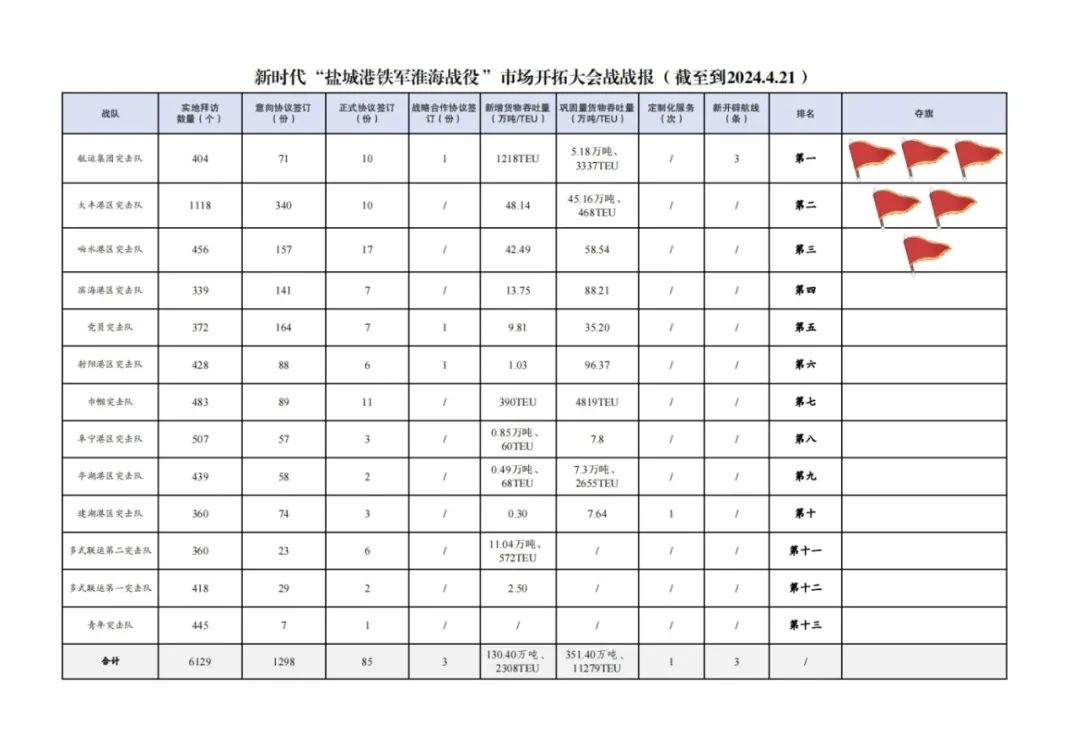 2.簽訂意向協(xié)議數(shù)量1298份:其中大豐港區(qū)突擊隊(duì)340份,黨員突擊隊(duì)164份,響水港區(qū)突擊隊(duì)157份,濱海港區(qū)突擊隊(duì)141份,巾幗突擊隊(duì)89份,射陽港區(qū)突擊隊(duì)88份,建湖港區(qū)突擊隊(duì)74份,航運(yùn)集團(tuán)突擊隊(duì)71份,阜寧港區(qū)突擊隊(duì)57份,亭湖港區(qū)突擊隊(duì)52份,多式聯(lián)運(yùn)第一突擊隊(duì)29份,多式聯(lián)運(yùn)第二突擊隊(duì)23份,青年突擊隊(duì)7份。