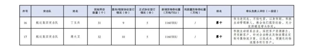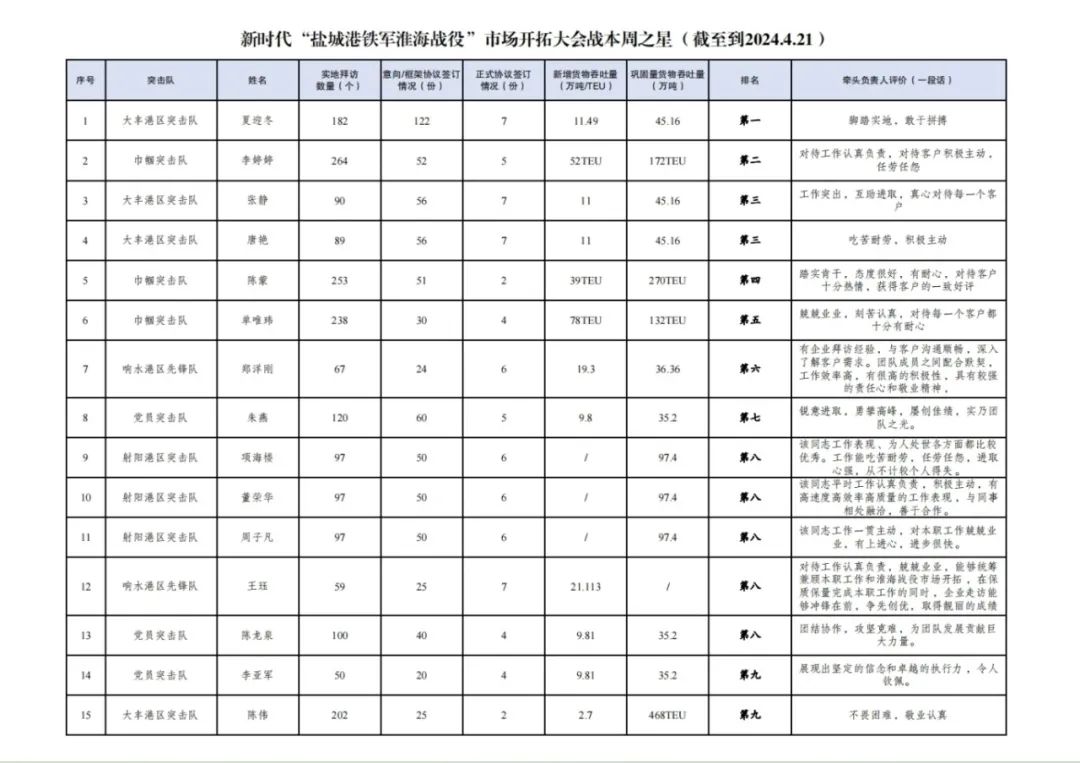 第一名:大豐港區(qū)突擊隊(duì) 夏迎冬(拜訪客戶182家,簽訂意向協(xié)議122份,簽訂正式協(xié)議7份,新增貨物吞吐量11.49萬噸,鞏固量貨物吞吐量45.16萬噸)