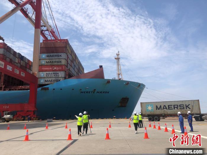 5月31日,27個從加拿大溫哥華進(jìn)口至中國的集裝箱,在上海洋山深水港碼頭被裝上“美若馬士基”輪。上海自貿(mào)區(qū)臨港新片區(qū)官方供圖