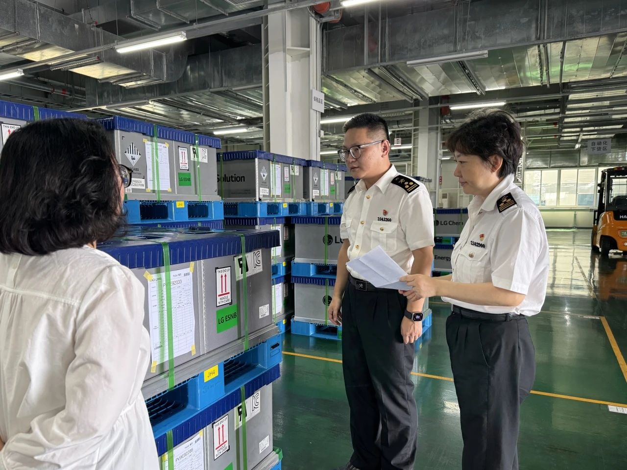 圖為:金陵海關關員對出口鋰電池循環包裝開展現場查驗。李巖/攝