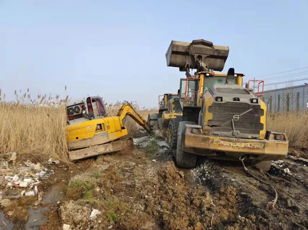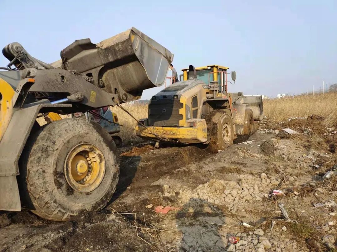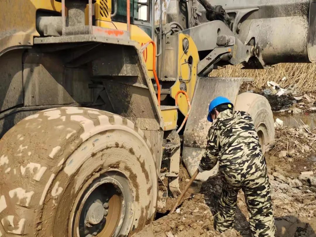 面對連續(xù)的失敗,響水港區(qū)團隊再次展現(xiàn)出了百折不撓,迎難而上的港口工匠精神,深刻剖析前兩次失敗原因,再次調集一臺小型挖機對事件車輛輪子周邊淤泥進行清理,回填石子提升其自身摩擦力,同時針對涉險裝載機陷入太深可能造成底盤擱置等情況,調配一輛裝載機協(xié)助抬升予以解決,并再次調集一輛裝載機采用接力模式增加牽引力。經(jīng)過多臺機械的通力配合,受困裝載機終于在拖拽中緩緩駛出泥潭,圓滿完成救援工作。