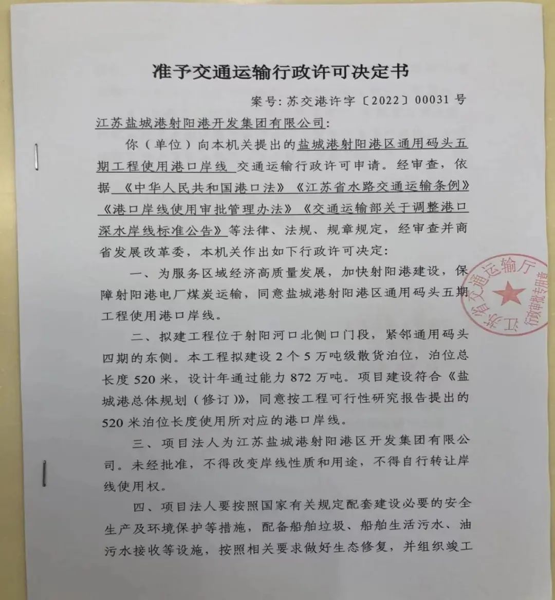 9月16日,鹽城港射陽(yáng)港區(qū)通用碼頭五期工程岸線取得江蘇省交通運(yùn)輸廳正式批復(fù)。截至目前,該項(xiàng)目前期工可報(bào)告、穩(wěn)評(píng)、通航安全技術(shù)報(bào)告、防洪評(píng)價(jià)、岸線全部通過批復(fù),這標(biāo)志著項(xiàng)目開工正式邁入“快車道”。
