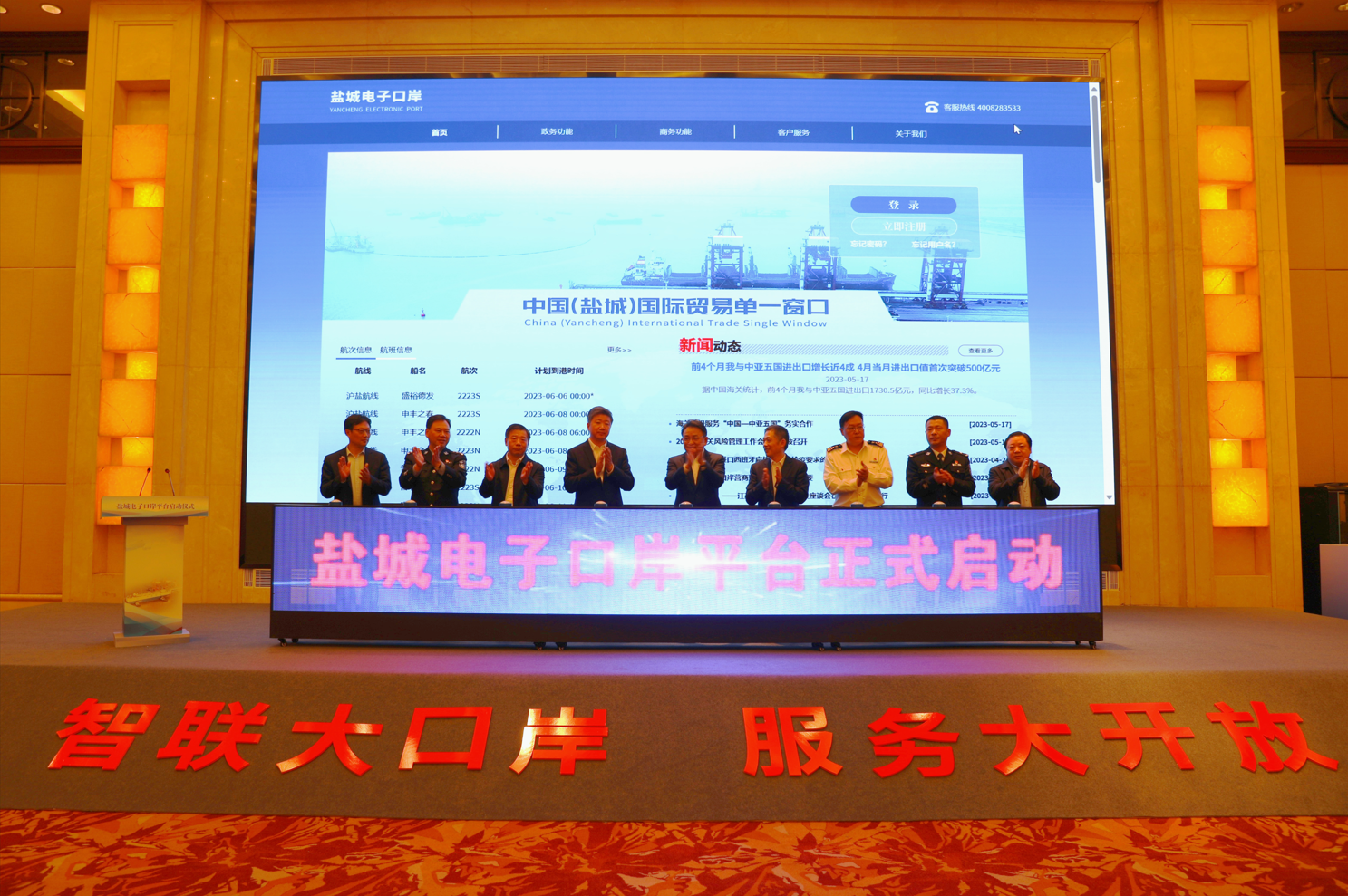5月18日,鹽城電子口岸平臺啟動儀式成功舉行。副市長唐敬出席會議并講話。鹽城港集團(tuán)黨委書記、董事長周正雄,市商務(wù)局局長、口岸辦主任郭慶生,鹽城海關(guān)黨委書記、關(guān)長吳志明參加并分別致辭。鹽城海事局局長程欣、鹽城機(jī)場出入境邊防檢查站站長邵紅軍、鹽城出入境邊防檢查站站長李興華、鹽城南洋國際機(jī)場有限責(zé)任公司董事長劉志軍等參加。市政府副秘書長張波主持活動。