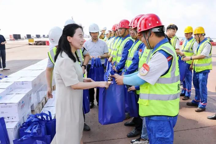 活動現(xiàn)場,袁欣與大家親切交談,詳細詢問一線職工的工作狀態(tài)和實際需求,對他們頂烈日、戰(zhàn)酷暑,始終堅守崗位的敬業(yè)精神表示衷心感謝,叮囑他們要注意防暑降溫,做好個人防護,并將防暑降溫“清涼禮包”送到職工代表手上。她說,當(dāng)前高溫、惡劣天氣逐漸增多,各單位要切實做好夏季防暑降溫工作,動態(tài)調(diào)整作業(yè)時間,為廣大員工提供清涼舒心的休息場所,全面保障人身安全。同時,要時刻繃緊安全這根弦,聚焦生產(chǎn)、消防重點領(lǐng)域,常態(tài)化開展安全隱患排查治理工作,做好值班值守和應(yīng)急處置,確保港區(qū)安全生產(chǎn)形勢穩(wěn)定。