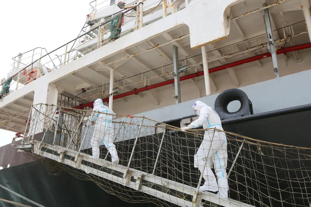 2020年12月8日,蒙古籍“普拉通”號外貿(mào)船在大豐港區(qū)候泊時,多名船員確診新冠肺炎。經(jīng)市委、市政府協(xié)調(diào),該輪于12月13日在相關(guān)護送船只的拖帶下駛?cè)霝I海港區(qū)通用碼頭港池。