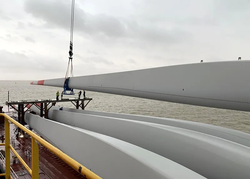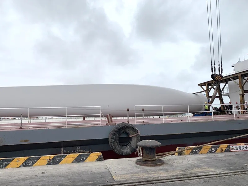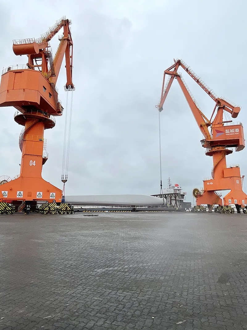 據(jù)悉,此次2套大型風(fēng)電葉片采用門座式起重機的作業(yè)方式裝卸,風(fēng)電葉片各長71.4米,兩套總重達280噸,該批次風(fēng)電葉片將從濱海港區(qū)裝船啟運至浙江岱山機位項目處。