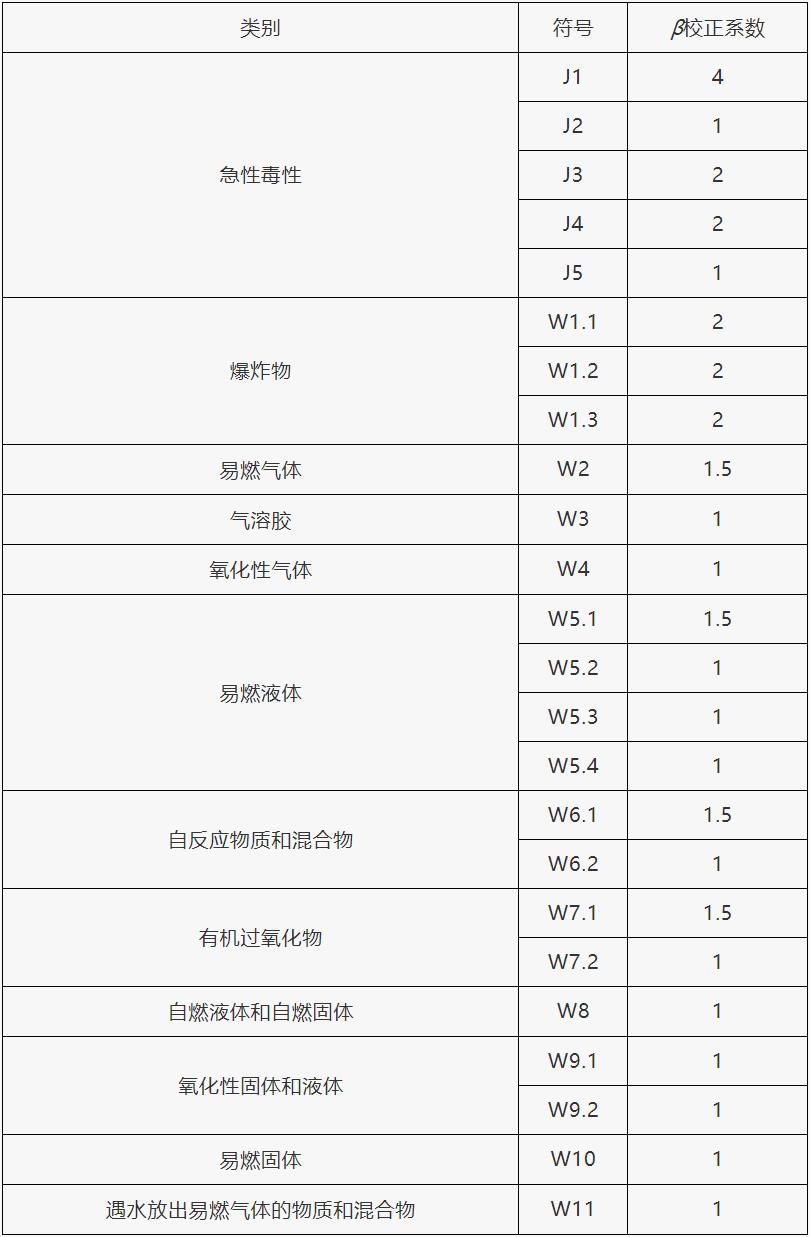 根據(jù)單元內(nèi)危險(xiǎn)貨物的類別不同,設(shè)定校正系數(shù)(β)值,在表1范圍內(nèi)的危險(xiǎn)貨物,其β值按表1確定,未在表1范圍內(nèi)的危險(xiǎn)貨物,其β值按表2確定。