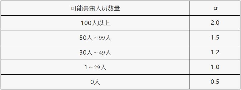 根據(jù)重大危險(xiǎn)源所在港口企業(yè)作業(yè)區(qū)邊界向外擴(kuò)展500米范圍內(nèi)常住人口數(shù)量,設(shè)定暴露人員校正系數(shù)(α)值,見表3。