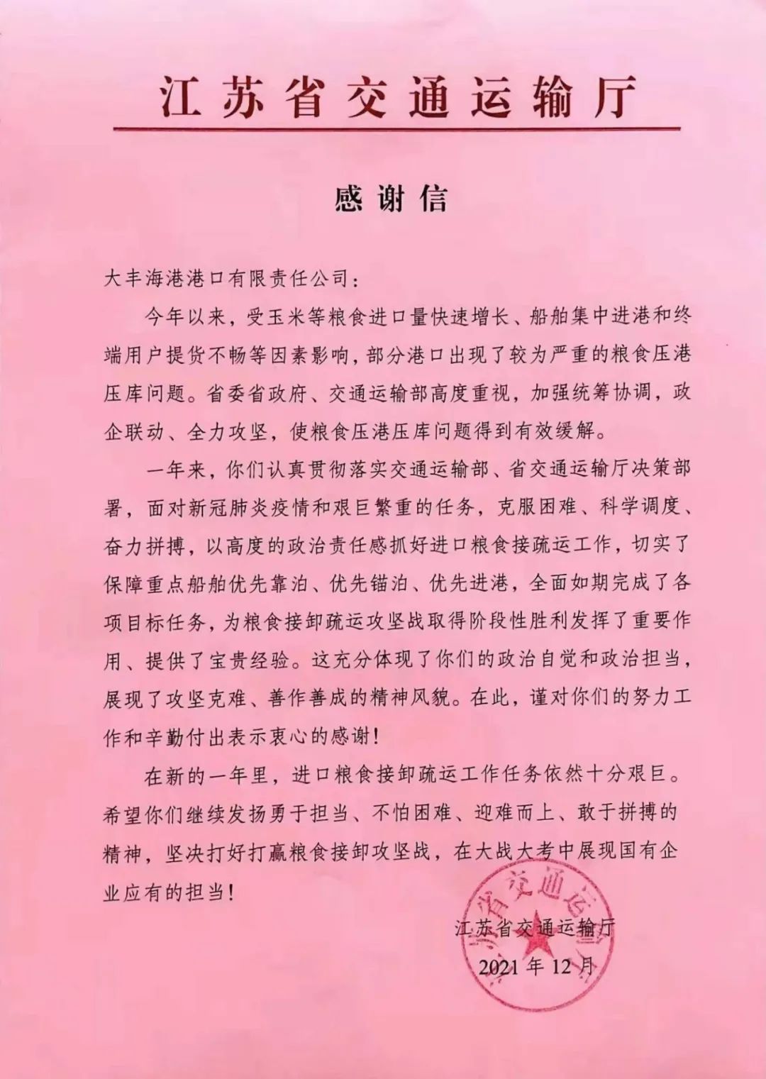 12月21日,省交通運(yùn)輸廳向集團(tuán)下屬港口公司發(fā)來(lái)感謝信,對(duì)港口公司面對(duì)新冠肺炎疫情和艱巨繁重的任務(wù),克服困難、科學(xué)調(diào)度,努力抓好進(jìn)口糧食接疏運(yùn)工作,以及廣大干部職工的努力工作和辛勤付出表示感謝。