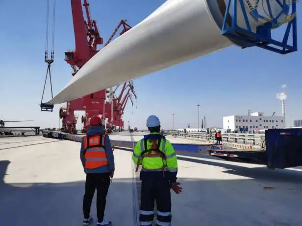 近日,隨著射陽港區(qū)第二班組指揮員的一句“好,可以往下繼續(xù)放”,自重40噸的大功率海上風電葉片,從港區(qū)3.5萬噸級碼頭1號泊位平穩(wěn)吊放在振興5的船舶甲板。看著風電葉片平穩(wěn)下落,現(xiàn)場作業(yè)人員都不由自主地鼓起掌來,這是港區(qū)首次自主成功裝卸單機葉片長度超過99米的7兆瓦風電葉片,也正式標志著射陽港區(qū)已完全具備自主裝卸大型風電葉片的能力。