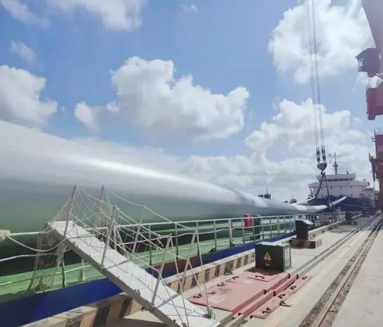 據(jù)了解,該型號風電葉片對集港運輸及裝船吊運標準要求較高。射陽港區(qū)在認真落實疫情防控各項措施的基礎上,與物流單位中悅大件公司密切配合,在裝卸前認真做好各項準備工作,制定詳細作業(yè)方案,選派精干力量組建作業(yè)專班,憑借高超的重大件吊裝技藝,僅用45分鐘便圓滿成功完成99米風電葉片裝卸的平穩(wěn)裝船。優(yōu)質高效的風電設備裝船能力得到各方高度認可和一致好評,再一次擦亮了射陽港區(qū)“風電裝卸服務”優(yōu)質品牌,以實際行動助力風電產業(yè)的發(fā)展。