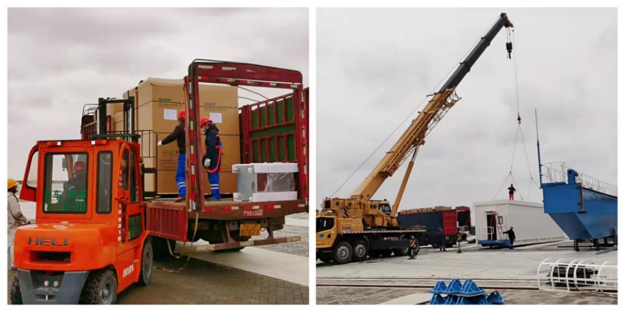 截至目前,重箱堆場、空箱堆場、熏蒸場地、港內堆場等基層、面層已全部完成,道路與堆場工程量已完成約98%,邊檢樓沉樁完成144根,進、出港閘口基礎與主體柱已完成4根,變電所、進出港閘口、查驗平臺及監管倉庫、維修保養車間、生活污水處理站等附屬設施土建方面工程量已完成約70%,1臺GJQ型41t-40m軌道式集裝箱門式起重機主體已吊裝完畢,即將進入調試階段。
