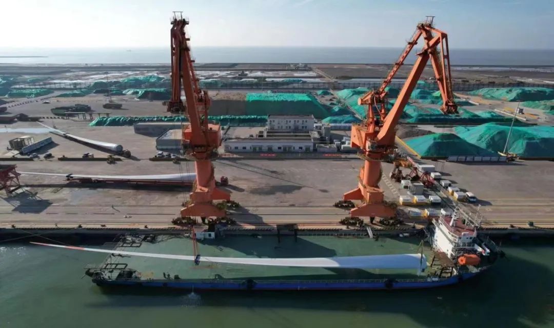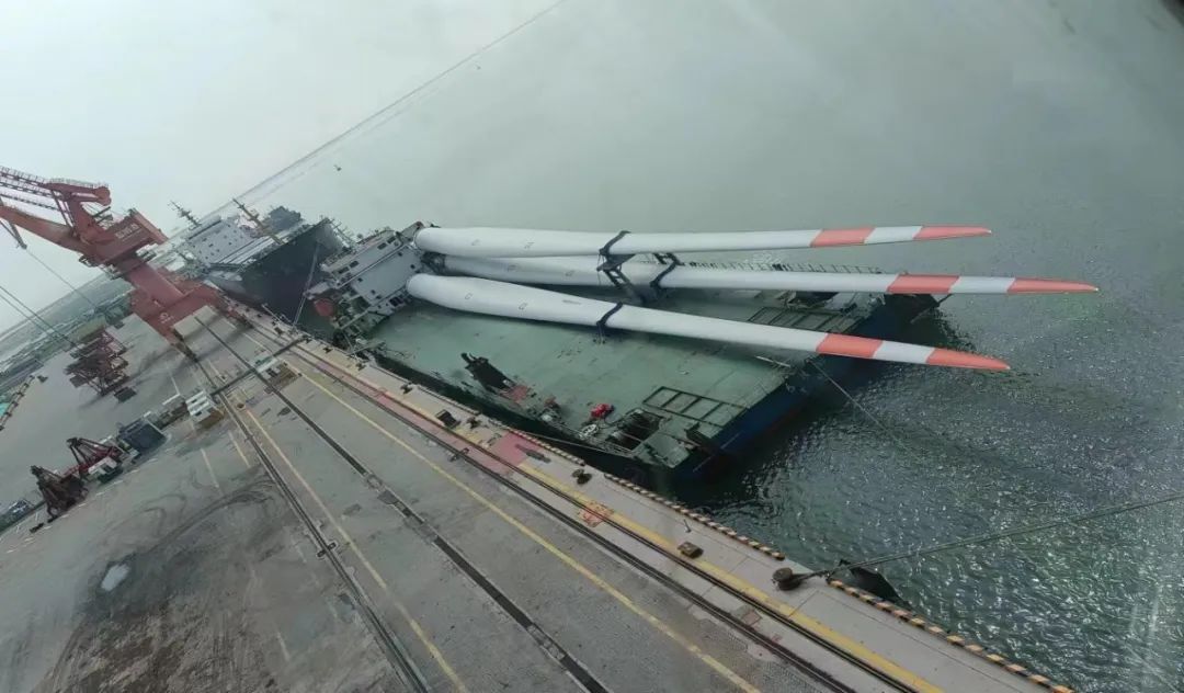 國(guó)電投山東海陽(yáng)項(xiàng)目首套風(fēng)電設(shè)備系濱海港建港以來進(jìn)港海運(yùn)最大的風(fēng)力葉片,全長(zhǎng)97米。此次運(yùn)載的風(fēng)力葉片從南通運(yùn)至濱海港區(qū)碼頭,由于該葉片體身長(zhǎng),運(yùn)輸過程中涉及安全系數(shù)較大,為確保萬無一失,從327省道轉(zhuǎn)入濱海港區(qū)后,生產(chǎn)經(jīng)營(yíng)條線安排專班人員實(shí)時(shí)跟蹤服務(wù),及時(shí)協(xié)調(diào)清理影響拐彎的部分隔離護(hù)欄,保障途中各轉(zhuǎn)彎要道口的通行安全,順利抵達(dá)目的地——濱海港碼頭1號(hào)泊位。至此,三根風(fēng)葉片全部被安全高效地裝載上貨輪,運(yùn)往國(guó)電投山東海陽(yáng)目的地。