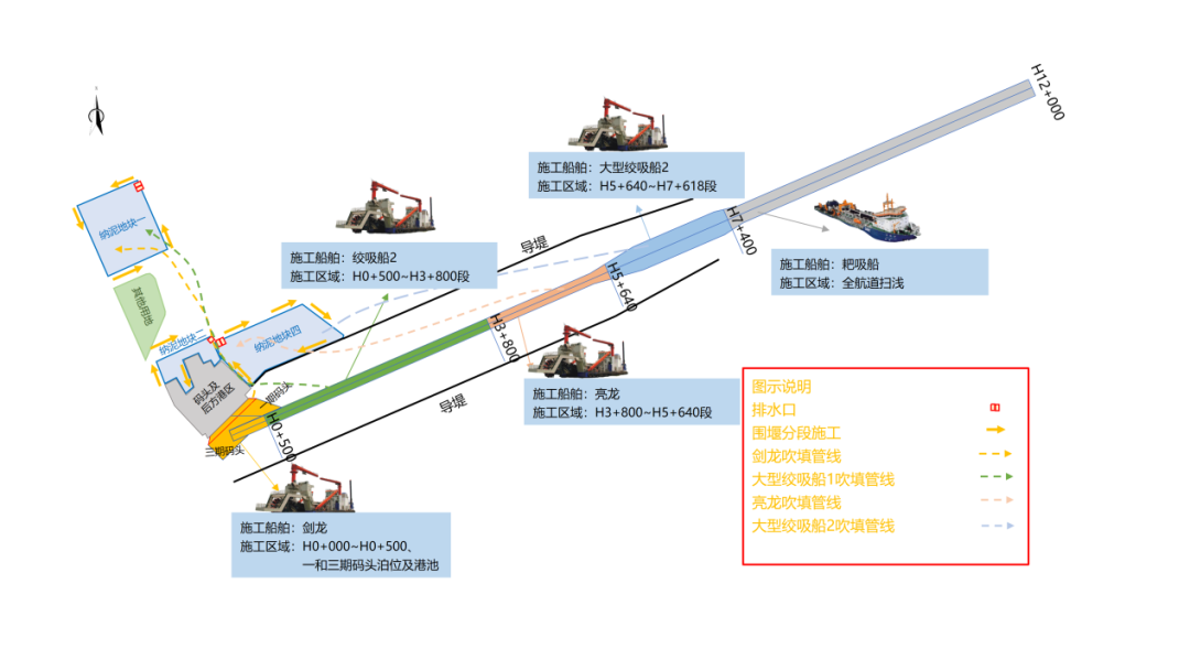 八月飄香季,奮斗正當時。在3.5萬噸航道上,機器轟鳴,“普交工1”號、“劍龍”號、“亮龍”號三“艦”合璧,將疏浚航道產生的疏浚土通過管線輸送到指定的納泥區。圍堰上,工人們鉚足干勁,土工布鋪設、袋裝土碼砌加緊施工……現場一片熱火朝天的建設景象。