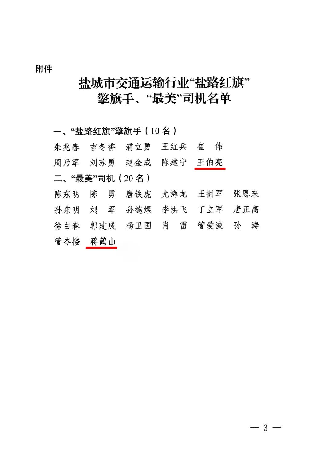 近日,中共鹽城市交通運(yùn)輸行業(yè)委員會(huì)印發(fā)《關(guān)于表?yè)P(yáng)鹽城市交通運(yùn)輸行業(yè)“鹽路紅旗”擎旗手和“最美”司機(jī)的通知》,集團(tuán)大豐港區(qū)王伯亮榮獲“鹽路紅旗”擎旗手榮譽(yù)稱號(hào),集團(tuán)響水港區(qū)蔣鶴山榮獲“最美”司機(jī)榮譽(yù)稱號(hào)。