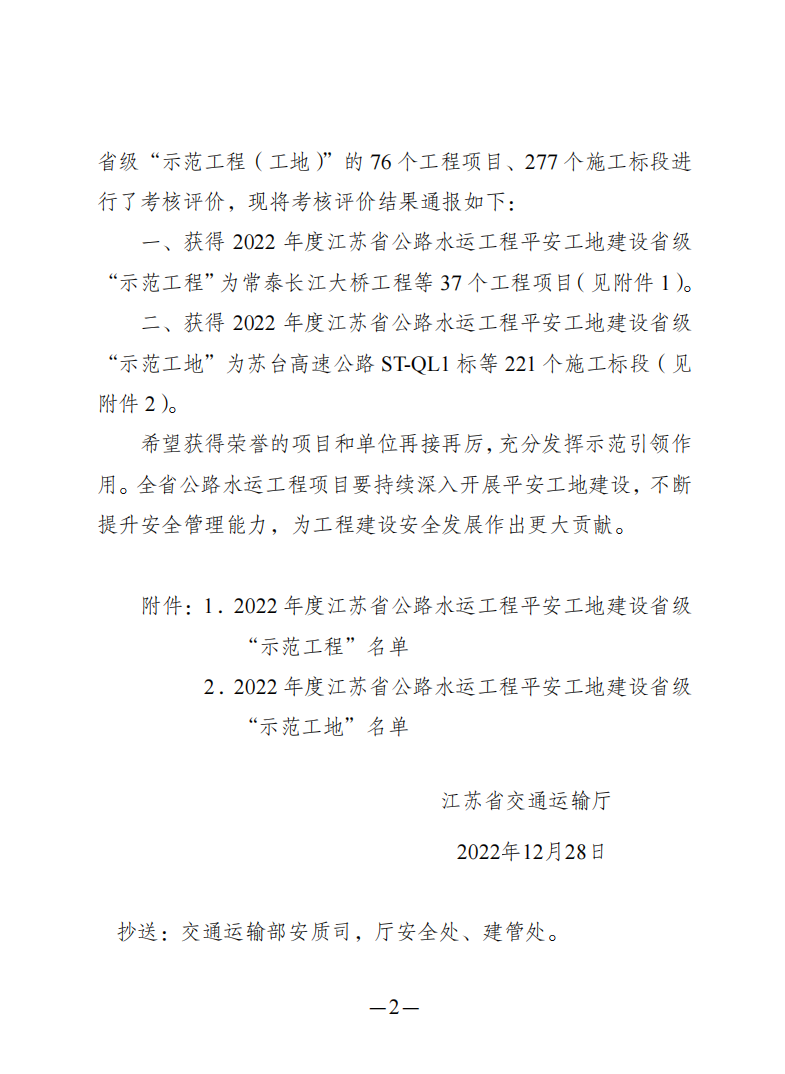近日,省交通運(yùn)輸廳發(fā)布2022年度全省公路水運(yùn)工程平安工地建設(shè)省級(jí)“示范工程(工地)”考核評(píng)價(jià)結(jié)果,灌河口5萬(wàn)噸級(jí)航道整治工程2個(gè)疏浚標(biāo)段獲評(píng)2022年度江蘇省公路水運(yùn)工程平安工地建設(shè)省級(jí)“示范工地”。