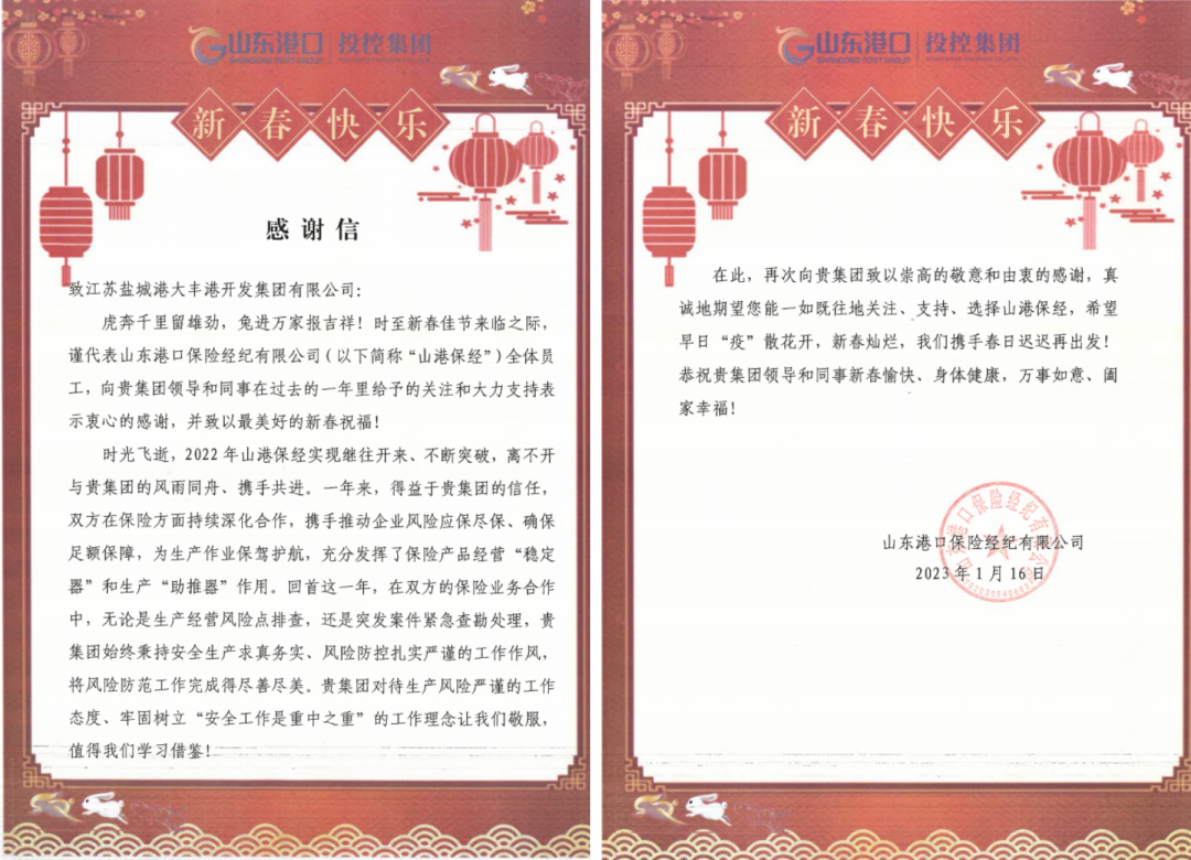 新歲序開,同赴新程。近日,集團下屬江蘇鹽城港大豐港開發集團、江蘇鹽城港港口公司、江蘇鹽城港航運集團三家單位分別收到來自山東港口保險經紀公司的感謝信。紙短情長,字字暖心。一封封感謝信,道出了鹽城港和山東港攜手發展的深厚情誼。