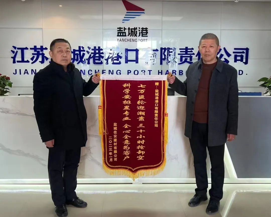 兔年伊始,鹽城港港口公司收到鹽城佳安建材有限公司贈送的錦旗,對港口公司所提供的優(yōu)質(zhì)裝卸服務(wù)表示感謝。