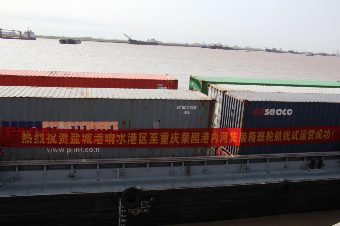 “嗚……”隨著汽笛的一聲長鳴,滿載集裝箱的“大港集003”號貨輪緩緩駛入鹽城港響水港區5#泊位碼頭,貨船上的工作人員向岸邊拋出系泊纜繩固定貨船,碼頭上等待已久的吊機開始作業,有條不紊地將集裝箱裝卸到拖車上。至此鹽城港響水港區至重慶果園港內河集裝箱班輪航線試運營成功,這是響水港區從“無”到“有”首次迎來的集裝箱貨輪。同時標志著通榆河段阜寧至響水正式開通內河集裝箱運輸,掀開了鹽城港響水港區與阜寧港區“港港聯動”的全新篇章。