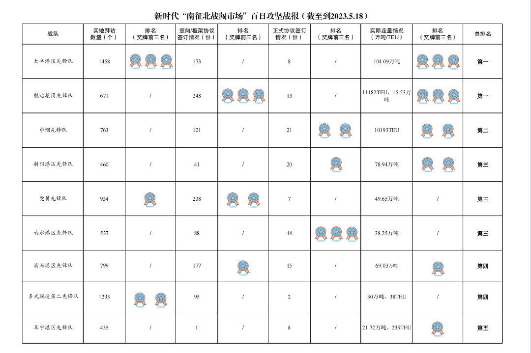 1.累計拜訪客戶數量9907家:其中大豐港區先鋒隊1458家,多式聯運第二先鋒隊1233家,黨員先鋒隊934家,濱海港區先鋒隊799家,多式聯運第一先鋒隊769家,巾幗先鋒隊763家,建湖港區先鋒隊693家,青年先鋒隊674家,航運集團先鋒隊671家,響水港區先鋒隊537家,亭湖港區先鋒隊481家,射陽港區先鋒隊460家,阜寧港區先鋒隊435家。