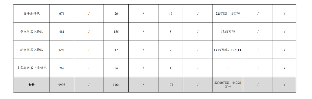 4.實際走量18601TEU、436.71萬噸:其中大豐港區先鋒隊104.09萬噸,航運集團先鋒隊11182TEU、15.53萬噸,射陽港區先鋒隊78.94萬噸,巾幗先鋒隊10193TEU,濱海港區先鋒隊69.03萬噸,阜寧港區先鋒隊21.72萬噸、235TEU,黨員先鋒隊49.65萬噸,青年先鋒隊225TEU、15萬噸,響水港區先鋒隊38.25萬噸,建湖港區先鋒隊13.49萬噸、127TEU,亭湖港區先鋒隊13.51萬噸,多式聯運第二先鋒隊30萬噸,38TEU。