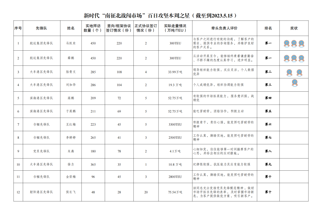 第一名:航運集團先鋒隊 馬躍東、薛鵬(拜訪客戶450家,簽訂意向協議220份,簽訂正式協議2份,實際走量300TEU)