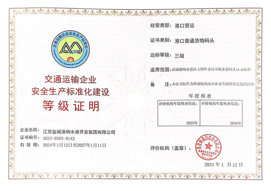 近日,鹽城港響水港區灌江港務分公司順利通過交通運輸企業安全生產標準化認證考核,并取得“交通運輸企業安全生產標準化建設三級證書”,標志著響水港區灌江港務分公司安全生產管理工作邁上新臺階。