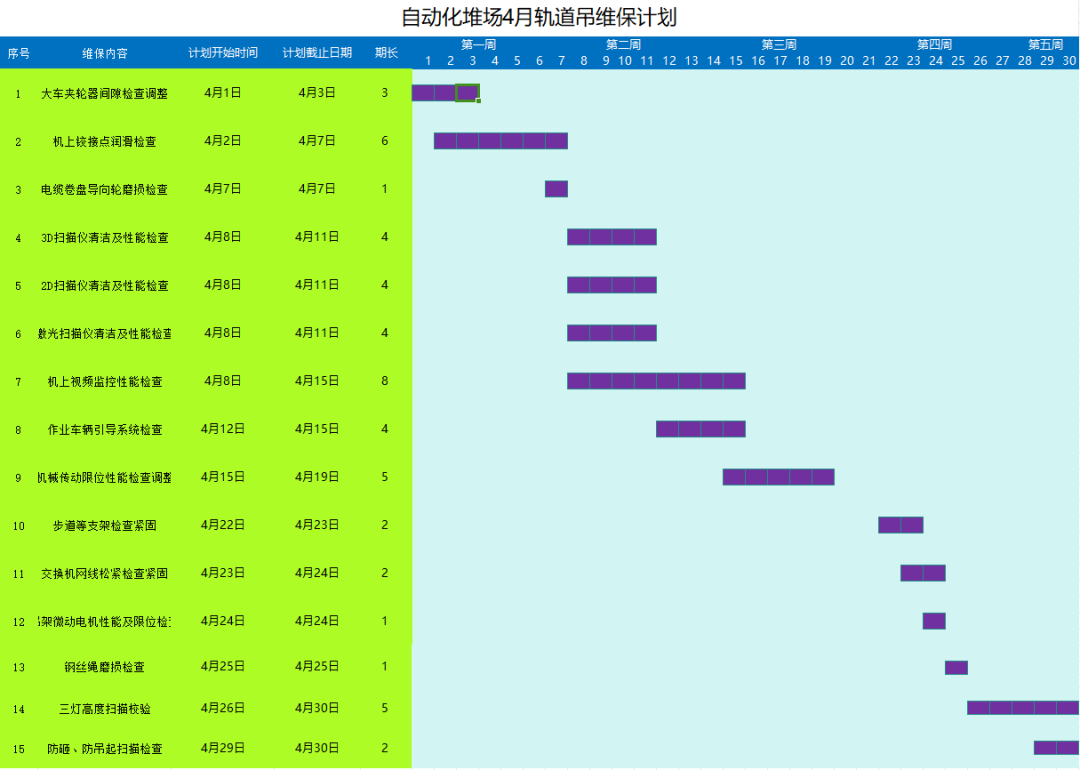 工欲善其事,必先利其器,只有良好的設(shè)備才能有效保證生產(chǎn)作業(yè)的高效運(yùn)轉(zhuǎn)。自動(dòng)化軌道吊集成了激光雷達(dá)掃描、相機(jī)姿態(tài)確認(rèn)、5G傳輸?shù)榷囗?xiàng)高科技,而現(xiàn)場(chǎng)作業(yè)對(duì)象則為重達(dá)40T的集裝箱且為露天作業(yè),精密設(shè)備與粗重活交織在一起,很容易因振動(dòng)、潮濕等原因造成設(shè)備故障而停機(jī),高度自動(dòng)化的生產(chǎn)環(huán)境,設(shè)備良好性能顯得尤為重要,一旦設(shè)備出現(xiàn)故障,不僅會(huì)導(dǎo)致作業(yè)的停滯,對(duì)港口經(jīng)濟(jì)效益及乃至聲譽(yù)也會(huì)產(chǎn)生嚴(yán)重影響,運(yùn)維團(tuán)隊(duì)結(jié)合實(shí)際狀況,針對(duì)設(shè)備的維保記錄、運(yùn)行狀態(tài)等提前制定了相應(yīng)的維保計(jì)劃,實(shí)行清單式管理,有計(jì)劃地提前對(duì)各類可能導(dǎo)致設(shè)備故障的隱患提前處理,盡可能減少設(shè)備維保盲區(qū),確保自動(dòng)化軌道吊保養(yǎng)工作落實(shí)落細(xì)。