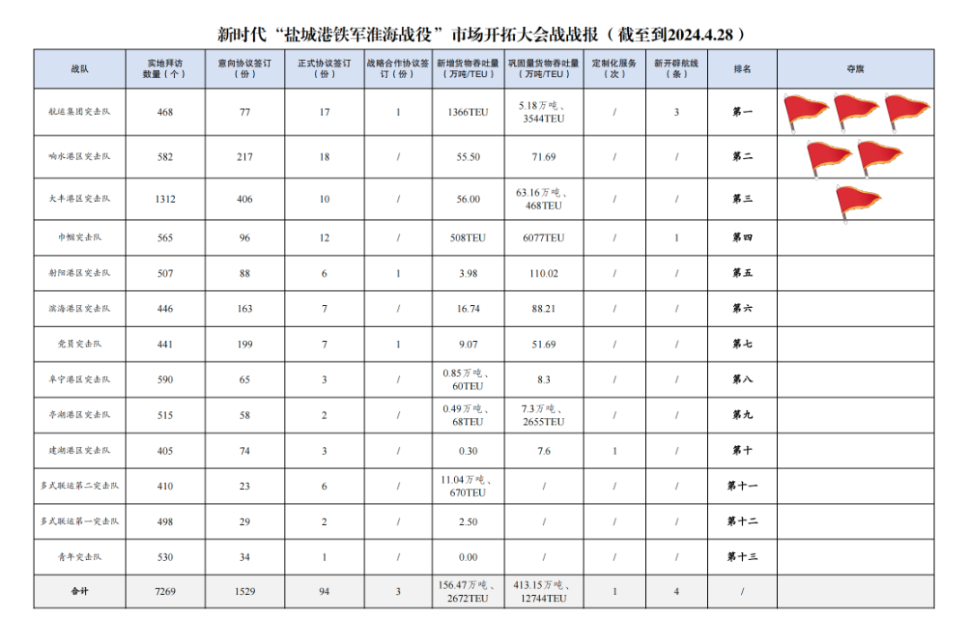 1.累計(jì)拜訪客戶數(shù)量7269家:其中大豐港區(qū)突擊隊(duì)1312家,阜寧港區(qū)突擊隊(duì)590家,響水港區(qū)突擊隊(duì)582家,巾幗突擊隊(duì)565家,青年突擊隊(duì)530家,亭湖港區(qū)突擊隊(duì)515家,射陽港區(qū)突擊隊(duì)507家,多式聯(lián)運(yùn)第一突擊隊(duì)498家,航運(yùn)集團(tuán)突擊隊(duì)468家,濱海港區(qū)突擊隊(duì)446家,黨員突擊隊(duì)441家,多式聯(lián)運(yùn)第二突擊隊(duì)410家,建湖港區(qū)突擊隊(duì)405家。