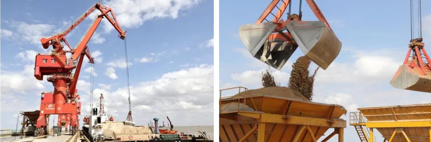 紅色的門(mén)機(jī)下行駛著來(lái)來(lái)往往的貨車(chē),紅色的漏斗等著他一次次的閉合