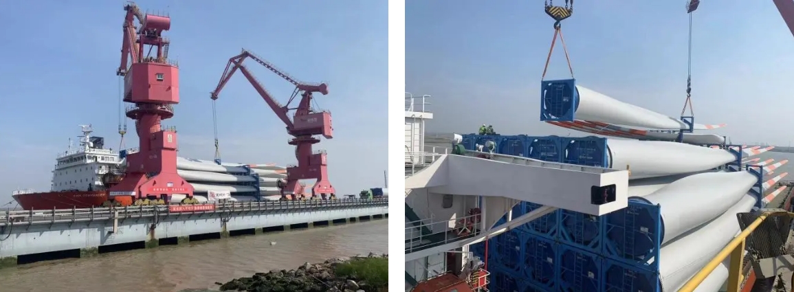 隨著第51支風機葉片支架成功入槽鎖扣,標志著鹽城港射陽港區3.5萬噸級碼頭1#泊位“海洋指揮官”輪17套風葉裝船作業完美收官。此次作業不僅實現了風電裝備外貿業務“零突破”;同時刷新了單層裝載用時最短、疊碼層數最高、鎖扣校點最多等多項裝船記錄。