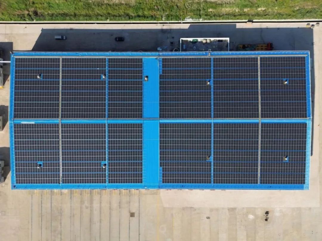 從高空俯瞰,整個(gè)屋頂被密密麻麻的光伏太陽(yáng)能板覆蓋,它們?cè)诹胰障蚂陟谏x,每一塊小小的光伏板都承載著巨大的綠色能量。