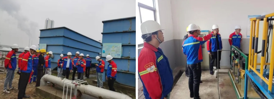 “初期雨水經碼頭和堆場收集管網流至污水處理站的3個收集池,通過抽水泵進入凈水器,管道中由加藥泵房加入絮凝劑,使廢水中懸浮物治理效果更好,經紫外線消毒流入凈化水蓄水池,使用污水處理泵站增壓用于堆場噴淋和消防用水。”污水站操作員一邊演示一邊向大家介紹,“我們加藥攪拌池按照1.5噸水配75KG聚合氯化鋁絮凝劑的比例,可處理1500T污水,配比是1:1000”