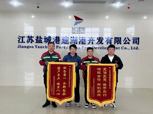 堅(jiān)守責(zé)任之心,勇?lián)姑巍=眨}城港建湖港區(qū)收到江蘇錦達(dá)保稅倉(cāng)儲(chǔ)股份有限公司及上海英斯貝克商品檢驗(yàn)有限公司贈(zèng)送的“服務(wù)第一 全心為企”與“互信互惠 攜手前行”榮譽(yù)錦旗,對(duì)鹽城港建湖港區(qū)在2024年度在鉻鐵運(yùn)輸業(yè)務(wù)中提供的優(yōu)質(zhì)服務(wù)表示高度認(rèn)可和支持。