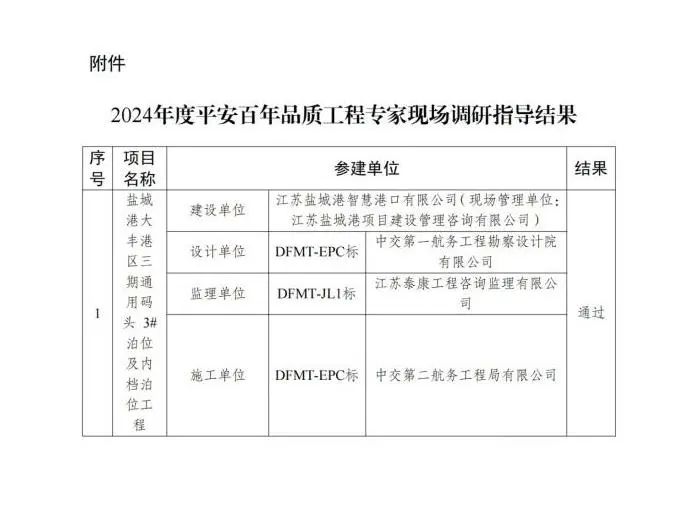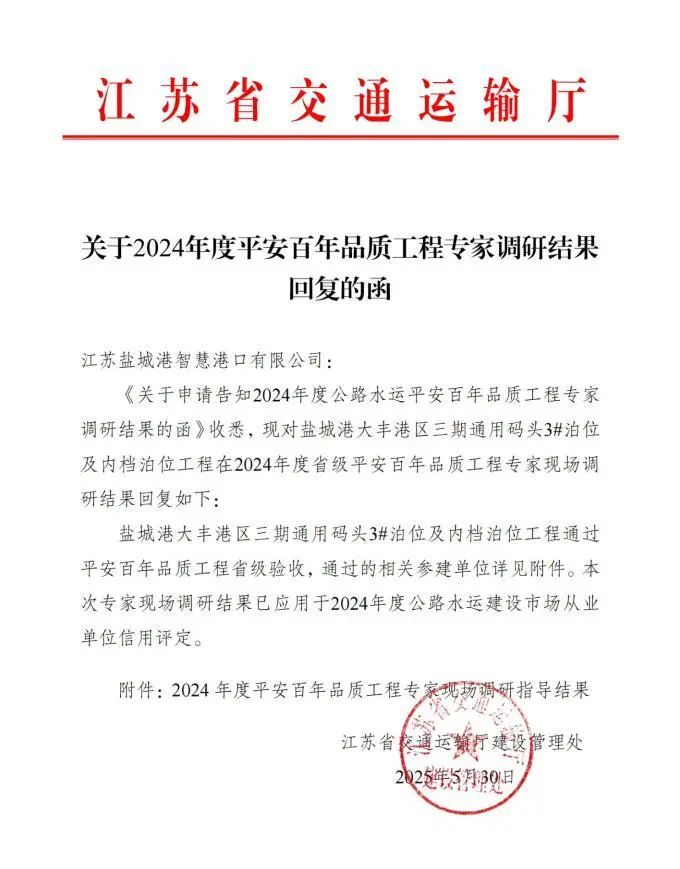 近日,省交通運輸廳公布2024年度“平安百年品質工程”專家現場調研指導結果,鹽城港大豐港區三期通用碼頭3#泊位及內檔泊位工程成功通過,標志著鹽城港在省級“品質工程”創建領域取得了歷史性突破。