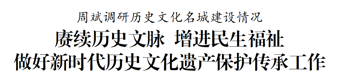 周斌在調(diào)研時強調(diào),歷史是城市的記憶,文化是城市的靈魂。各地各部門要堅定文化自信,堅持守正創(chuàng)新,自覺扛起歷史文化遺產(chǎn)保護傳承的政治責(zé)任,以繡花功夫守護歷史文化遺產(chǎn)、延續(xù)鹽城文脈,開創(chuàng)新時代歷史文化遺產(chǎn)保護傳承工作新局面。要正確處理好傳統(tǒng)與現(xiàn)代、保護與發(fā)展的辯證關(guān)系,充分挖掘利用歷史文化遺產(chǎn)的多重價值,以改革創(chuàng)新精神推動歷史文化遺產(chǎn)創(chuàng)造性轉(zhuǎn)化、創(chuàng)新性發(fā)展。