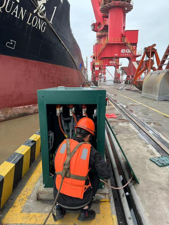6月1日,隨著最后一座智慧岸電完成調試并投入使用,“中鐵樁號”打樁船成功接入岸電,這標志著鹽城港智慧岸電升級改造工作圓滿完成。此前連續運轉的“中鐵樁號”終于得以“休息片刻”,轟鳴聲消失讓作業人員收獲了難得的安靜,碼頭廢氣零排放讓空氣也清新了幾分在為碼頭帶來更加舒適的作業環境的同時,有效減少了船舶燃油消耗。
