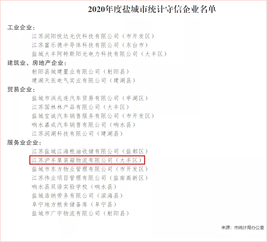 鹽城港滬豐集裝箱公司榮獲2020年度統計守信企業稱號